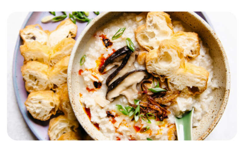 Serve the congee in bowls. Have sliced scallions, fried shallots, chili oil, and sliced fried dough sticks on the side for topping.